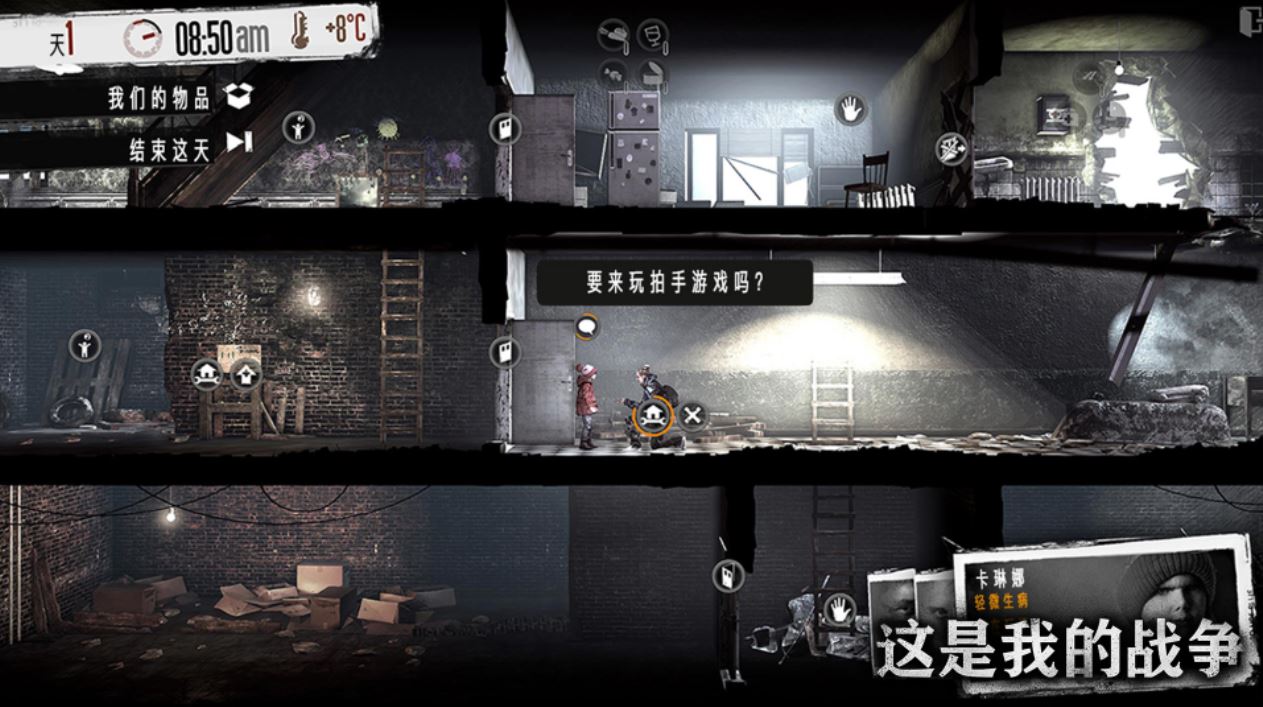 你好,你是否曾经想过玩这样一款游戏:你被困在一个充满轰炸和战争的城市中,当你的角色不可避免地因家园不断遭到袭击而受伤时,你挣扎着、尝试着,却无法提供食物、补给和绷带?这是适合你的游戏。